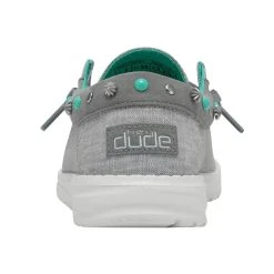This women’s moc shows off Western details with silver and turquoise studded features and hand stitching. Enjoy the Hey Dude features that you are familiar with: ultralight outsole, elastic laces and memory foam footbed.